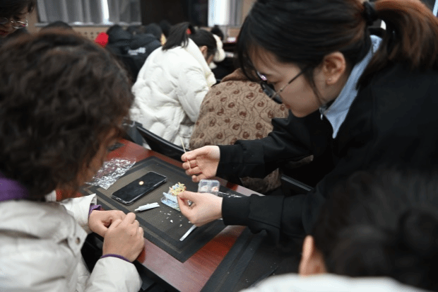活动现场气氛热烈而温馨。螺钿胸针制作区,非遗传承人给学员们讲解这一独特手工艺品的文化内涵与创意灵感。女职工巧嵌螺钿细片,指腹轻碾间,一支支精美绝伦的螺钿胸针在大家的巧手下诞生,它们在灯光下熠熠生辉,宛如艺术品一般。