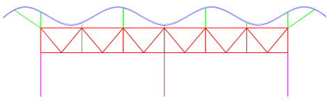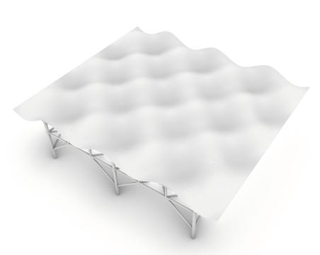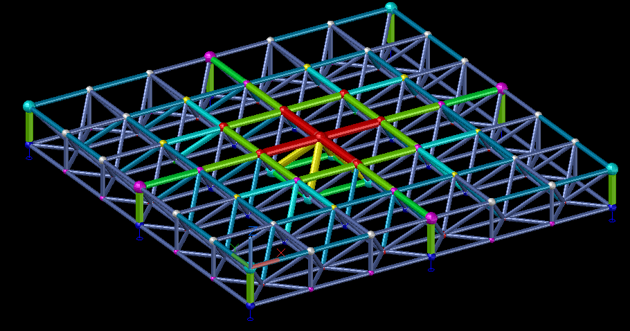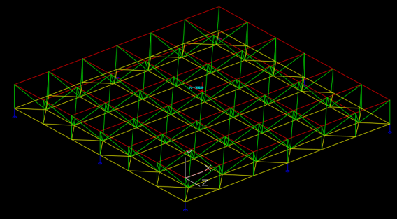 根据建筑方案的造型,结构方案决定采用正放四角锥网架结构。网架结构与小立柱相结构的方式便于屋面复杂造型的实现。同时为保证下部空间,网架采用下弦支撑。而且采用网架结构在仅承受竖向荷载的条件下可以实现柱仅承受压力,在柱底没有可靠连接的情况下避免发生剪切破坏。
