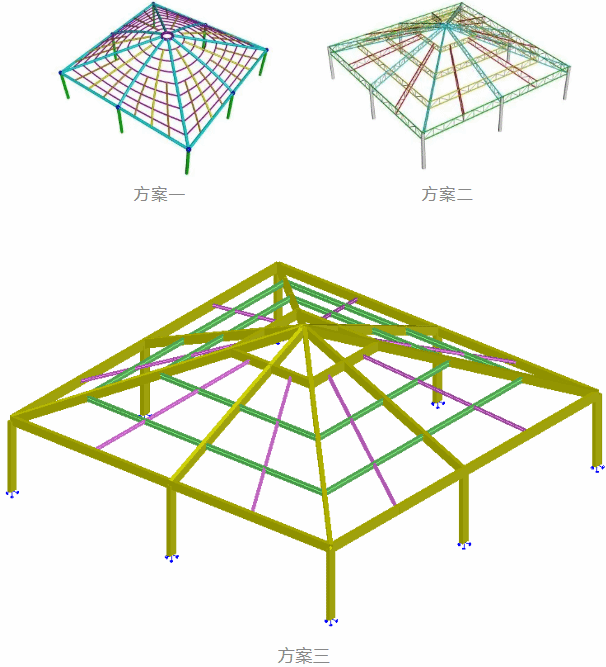 随着考古发掘的发展,大跨结构在遗址保护中的应用越来越多,结合本次项目的特殊性,我们本着“经济安全、空间灵动与美学融合”的理念对该项目进行了设计分析。本项目为28mx28m的方形古遗址保护,共设计三种方案,方案一:网架桁架结构;方案二:单层网壳结构;方案三:“穹顶形式”的梁柱结构受力体系;最终采用3D打印技术进行实体模型加载。