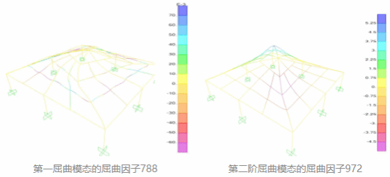 采用SAP2000对结构进行线性屈曲分析,在顶部施加节点荷载1N,通过BUCKLING工况计算得到求得屈曲模态的变形如下:
