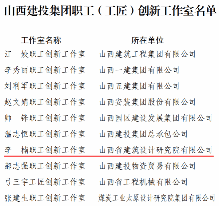 喜报!热烈祝贺李楠职工创新工作室获评山西建投集团职工(工匠)创新工作室