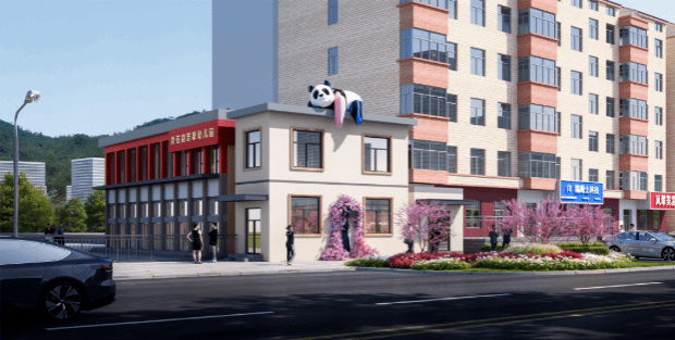 节点5紧邻幼儿园,故其外立面设计融入卡通熊猫造型,为静态建筑赋予活泼的动态质感。其下方配置粉紫色花藤装饰,周边环绕盛开的花树,整体风格特质极具视觉趣味性。