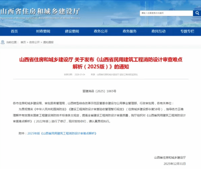 2025年12月31日,由山西省住房和城乡建设厅委托我院修订的《山西省民用建筑工程消防设计审查难点解析(2025年版)》(以下简称《难点解析》)正式发布实施。该文件自2022年首次发布以来,已成为我省消防设计审查领域的重要技术依据,此次在2022版基础上进行迭代优化,更贴合当前行业实践,持续为我省民用建筑消防安全筑牢技术防线。