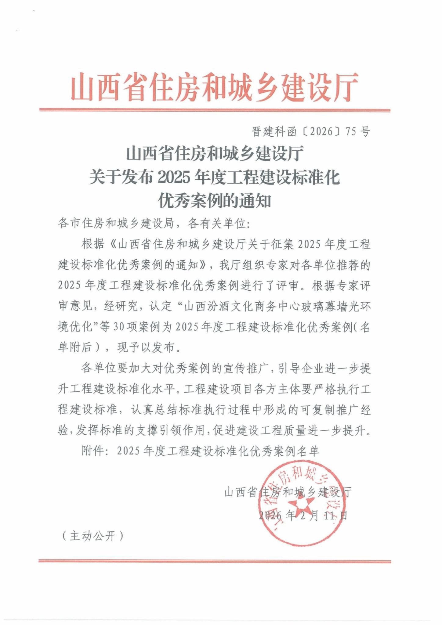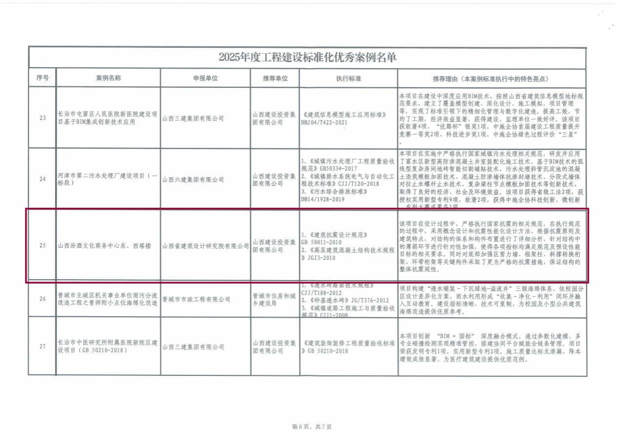 近日,山西省工程建设标准化优秀案例征集结果正式公布,我院太原武宿机场三期改扩建工程航站区工程综合交通中心工程(GTC)、潇河国际会展中心、太忻一体化经济区(大盂区)标准化厂房基础设施项目(一期)A区、山西农谷智慧冷链物流园项目、忻州艺术中心“大剧院·群众艺术馆”、山西汾酒文化商务中心东西塔楼共六个项目成功入选《2025年度工程建设标准化优秀案例名单》。