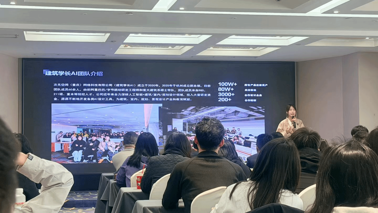 本次交流会特邀“建筑学长”AI联合创始人蒋婉琪、创作平台负责人高航担任主讲,围绕“如何用AI辅助设计—— 建筑学长 AI 平台在设计各阶段的应用”主题,聚焦设计全流程实战应用:从前期方案草图快速生成、概念创意推演,到中期效果图智能渲染、视觉表达提升,再到后期设计成果快速优化、细节迭代,逐一拆解操作技巧,并开展现场实操演示,让参会人员直观掌握 AI 工具落地方法,内容紧贴设计实践、干货满满。