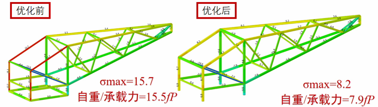 对比优化前后发现,相同荷载下,结构最大应力由15.7MPa降至8.2MPa,自重与承载力比值由15.5fP降至7.9fP(f是屈服强度,P是荷载),说明通过优化,结构的承载力提高,材料消耗量降低。