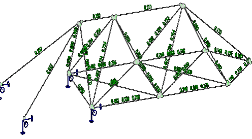 我们可以看到初步构思的力学模型为传统桁架结构,在此基础上形成一榀空间桁架结构(见结构模型1)。该模型可将整体梁系杆件的受弯形式,转变为杆件的拉压模式,进而解决木杆整体受弯弱的性质。其中该结构传力简单明确,受力均匀,可以合理利用杆件的拉、压特性,承载能力较大;但模型杆件较多,节点绑扎困难,自重大。而结构模型2采用角锥单元与绳索单元结合的结构形式,所用受压杆件为统一标准长度的木杆,受拉杆件采用绳索代替,杆件简洁,经济合理,具有美观性。