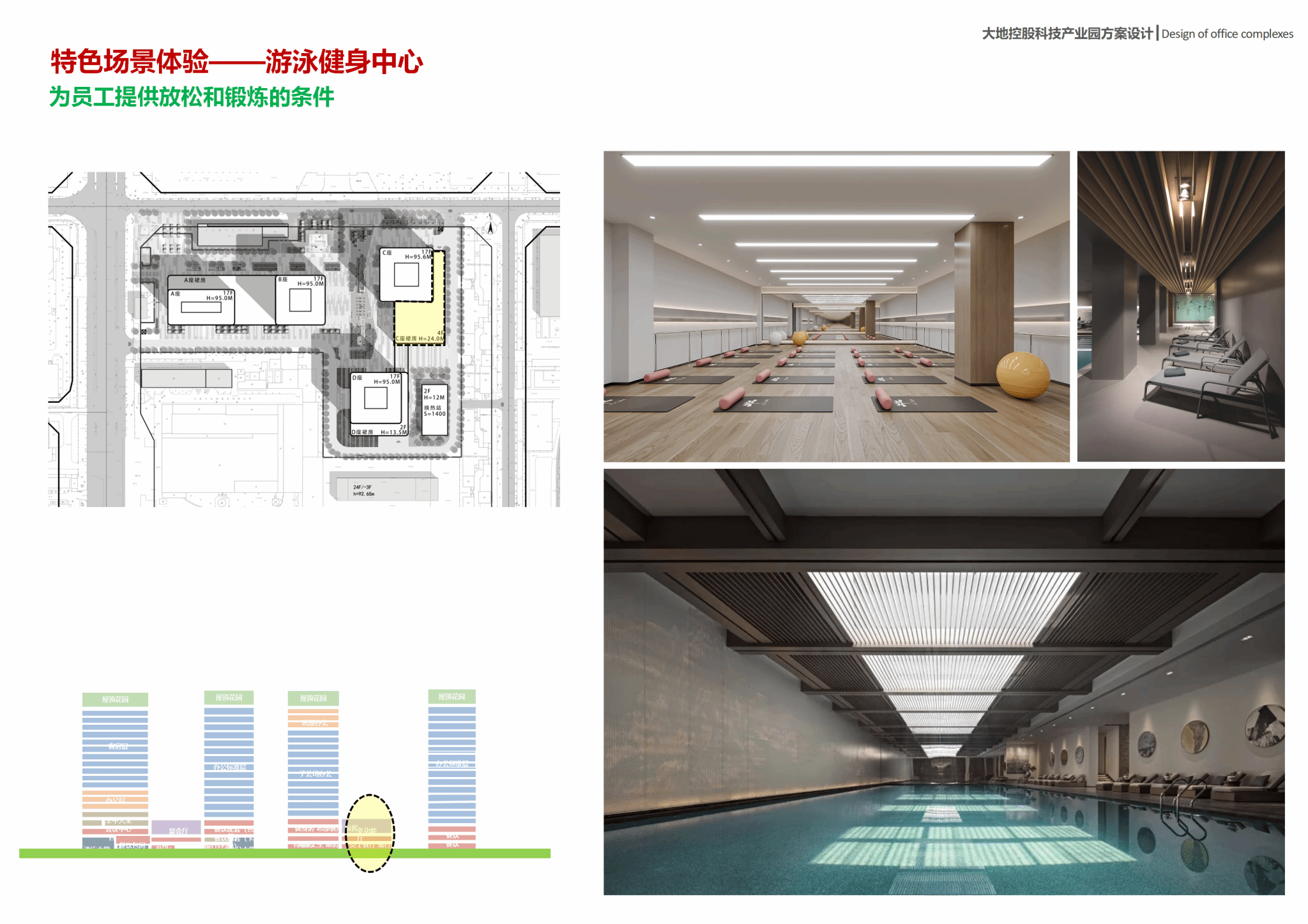 传统的办公空间往往采用固定的隔断和封闭的办公室,这限制了员工的互动和协作,不利于其余创新和效率的提升。在本项目设计过程中,通过创新办公空间的设计以提升企业效率、适应未来多变的发展,具体为:采用合适的柱网和开间构件弹性、通用的单元,打造具有显著模数化、通用式、模块化、可变性特征的新空间,以应对未来办公场景可能面临的各种变化。另外,创新办公空间设计还关注员工的身心健康。本项目通过设置屋顶花园、空中花园、健身中心和娱乐设施,为员工提供放松和锻炼的机会,提高员工工作效率和创造力。