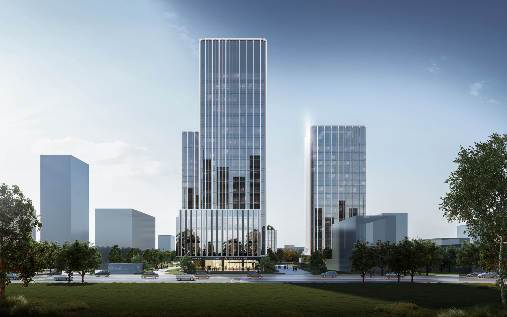 建筑立面设计紧扣现代科技商务区的功能定位,以简洁的竖线条和玻璃幕墙为主体,展现出稳重、大气的现代形象。立面设计注重挺拔气势与层次感的结合,通过高大入口门厅营造庄重的仪式感,标准层空间则以通透灵活的布局赋予使命感与未来感。夜间,灯带装置点亮立面,与周边建筑共同构成鲜明而统一的城市景观。材质选用白色与红铜色不锈钢,既体现科技商务的简洁现代,又增添建筑的质感与耐用性,全面提升园区的整体形象与使用体验。