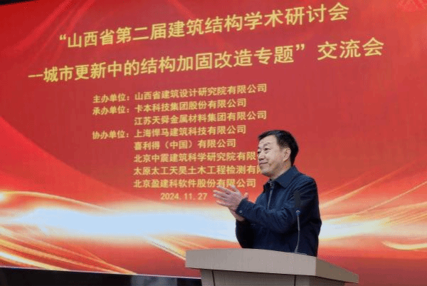 2024年11月27日,由山西省建筑设计研究院有限公司主办、卡本科技集团股份有限公司与江苏天舜金属材料集团有限公司承办、上海悍马建筑科技有限公司、喜利得(中国)有限公司、北京中震建筑科学研究院有限公司、太原太工天昊土木工程检测有限公司、北京盈建科软件股份有限公司协办的“第二届山西省建筑结构学术研讨会——城市更新中的结构加固改造专题”顺利召开。本次会议聚焦于城市更新背景下的建筑结构加固与改造技术,吸引了来自行业内的专家、学者及企业代表参与,共同探讨了结构加固改造领域的最新发展与前沿技术。