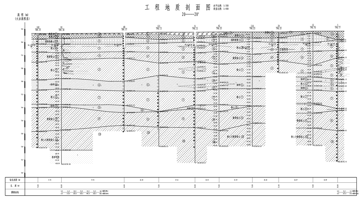 我们经过反复推敲验算,并结合本次勘察的原位测试、土工试验,综合内外业资料缜密分析后,认为当采用满堂布桩,以第⑥层细砂与粉土互层为桩端持力层时,有效桩长约20m,承载力按⑥1层细砂qpk取1600kPa,能够满足上部结构对承载力的要求。经综合分析外业资料,分层统计土工试验成果资料,提供高强预应力(PHC)管桩和钢筋混凝土灌注桩两种桩基形式,以供建设单位和设计单位进行比选。并提供了各种桩型的桩端持力层和设计参数,保证桩基基础安全、经济合理。