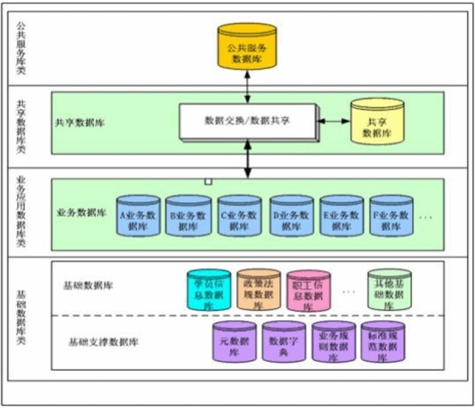 数据库是信息化建设的重要基础。数据库设计通常是作为应用系统开发的一部分进行的,但在应用系统开发中数据库设计具有特殊的重要性和相对独立性。一般校园数据中心数据库体系共分为四层,分别为基础数据库类、 业务应用数据库类、共享数据库类和公共服务数据库类,每层都起着不同的功能和作用,数据中心数据库体系结构如下图所示: