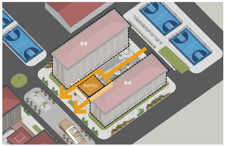 本工程为新建学生公寓,设计总建筑为24475m2,分南北两座单体,南北两座公寓宿舍共享中间的学生活动中心与超市,通过连廊雨棚将三座建筑连接起来,使内部庭院与校园道路空间贯通。北楼37m,地下1层,地上9层;南楼26.8m,地下1层,地上6层。本工程地下部分平时用途为平层汽车库,战时用途为甲类二等人员掩蔽所,地上部分功能为宿舍,共设计453间宿舍,床位数量1768张,属于特大型宿舍,建筑定性为二类高层公共建筑。