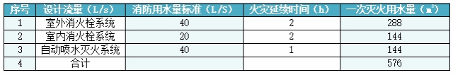本工程为学生公寓,按二类高层公共建筑进行消防设计,消防给水系统按设计范围内同时发生一次火灾设计,本工程一次火灾设计总用水量为576m3。