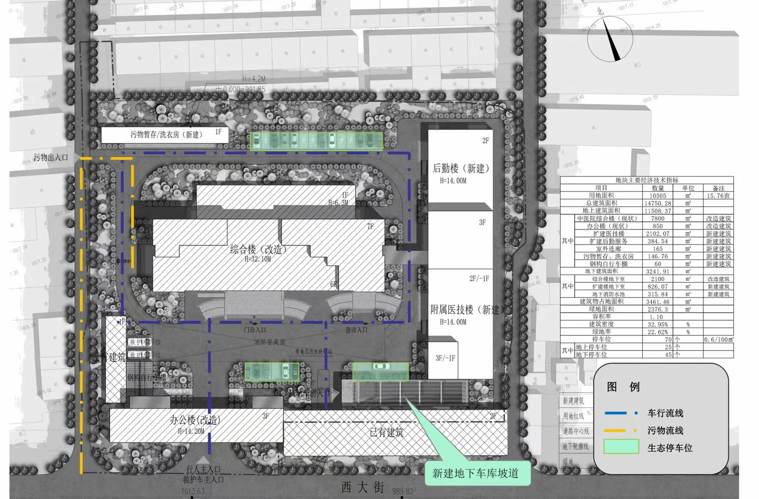 为满足医院改造功能设计及二甲医院标准要求,新建一座三层医技后勤楼,一层主要功能为大厅、餐厅、食堂及换热站,二层主要功能为中医治未病科室、中医特色治疗科室,三层主要功能为中医康复治疗区。