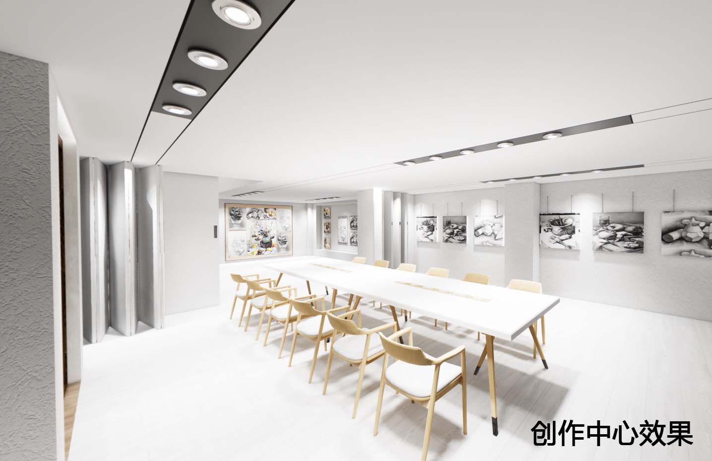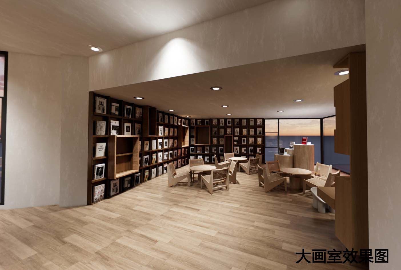 步入王沂东美术馆创研中心,室内空间以“艺术生产与人文关怀共生”为脉络,打造沉浸式创作生态。室内功能以创作工作室、学习交流区、休息区、大画室为主。创作工作室倚窗而设,落地玻璃将太行山的四季框成天然画布;学习交流区在夯土墙面上悬挂着未完成的画稿与笔记,形成自由讨论的“思想磁场”;休息区以低饱和色调营造静谧,让疲惫消融于云卷云舒;挑高9米的大画室则是空间的灵魂,顶部天窗洒下流动的天光,可移动画架与升降设备满足巨幅创作需求,无声诉说着每一幅作品的诞生史诗。这里不仅是艺术的工坊,更是土地与创造力交织的呼吸场域。