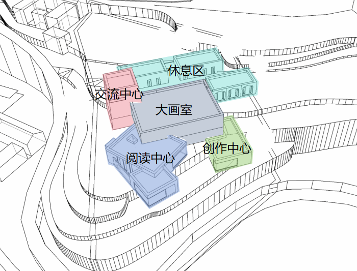王沂东创研中心以“屋即画框”为灵感,将建筑解构为散落于山脊的“艺术画框群”。以错落的几何体块呼应太行山崖的层叠肌理,每一处功能空间——创作工作室、大画室、交流区与休息区——皆被赋予独立“画框”形态,或嵌入山体,或悬挑于谷间,似艺术家随手搁置的未完成画作,与远山、村落共同构成动态的艺术拼图。