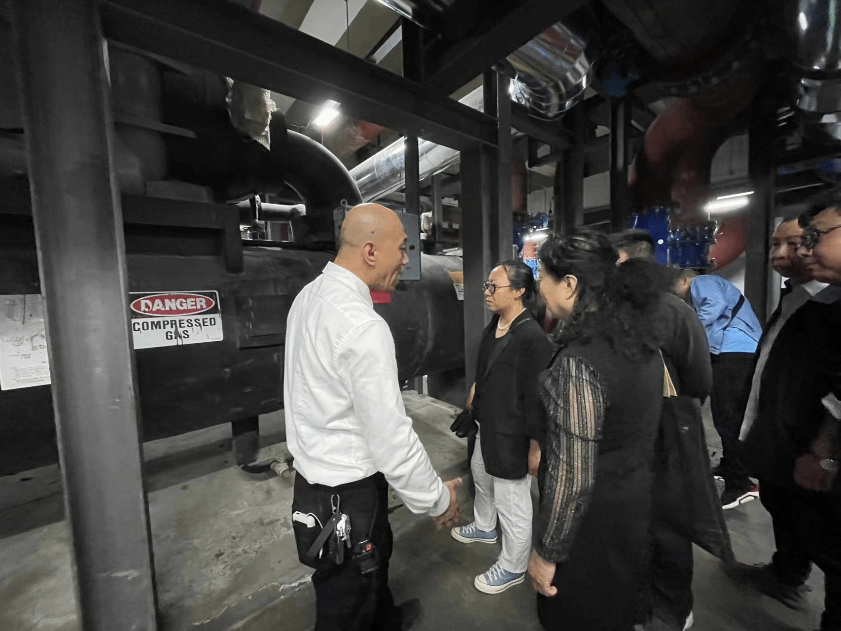 进入制冷机房,第一感觉就是噪音偏大,观察到机组运行数据中温差仅有1度,针对这个疑问我们与运营方进行沟通,确认原因在于万达开业初期,部分商业还未正式进入运营阶段,导致空调系统末端负荷偏小,而制冷机单台机组容量偏大,导致机组处于低负荷运行,进而出现轻微喘振的现象。团队现场提出运行策略调整建议,能缓解当前问题,也为类似项目积累了宝贵经验。