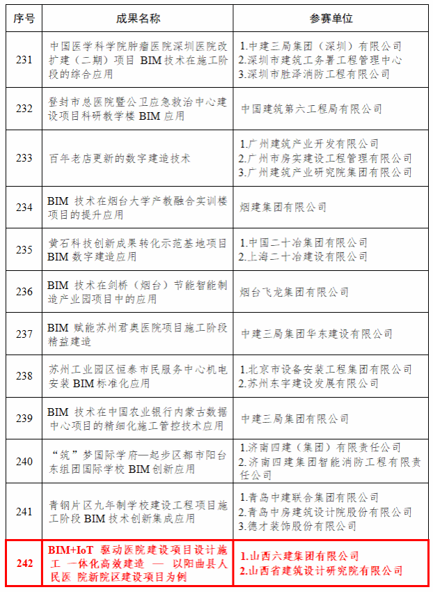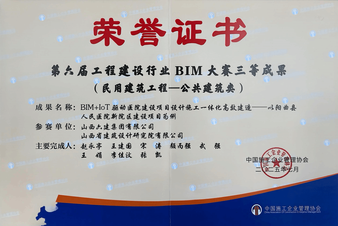 2025年中国施工企业管理协会组织开展了第六届工程建设行业BIM大赛,共有2543个项目参赛。经形式审查、专家网评、决赛答辩、综合审议及网络公示等环节,我公司与山西六建集团有限公司联合申报的《BIM+IoT驱动医院建