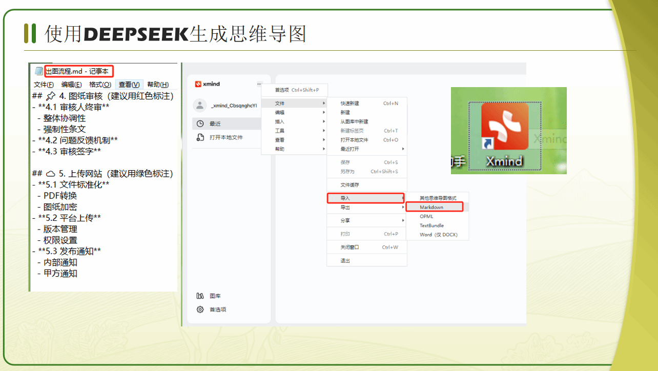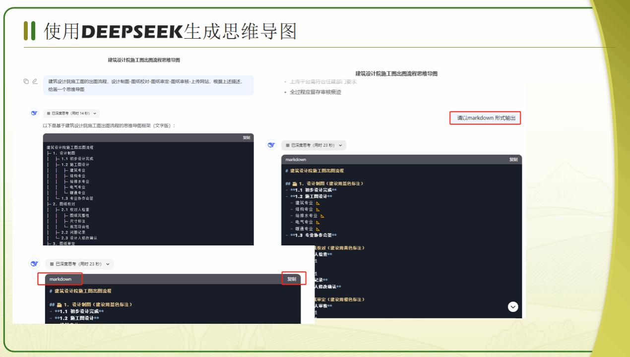 - 利用DeepSeek将自然语言转化为思维导图与PPT,极大提升了汇报与复盘效率。