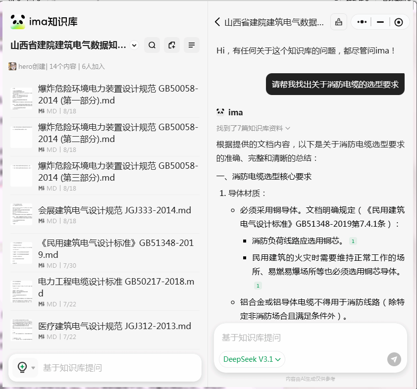 上图为我小组共同建立的省院建筑电气知识库。涵盖了与工作紧密相关的国标规范、地方规范等,在手机小程序中便能浏览、提问、查找规范内容,非常便捷,缩短了翻书查找的时间,并且避免了查找不全面的弊端。此知识库还具有查找范围严谨的特点,保证了由提问给出的参考内容可靠、准确。