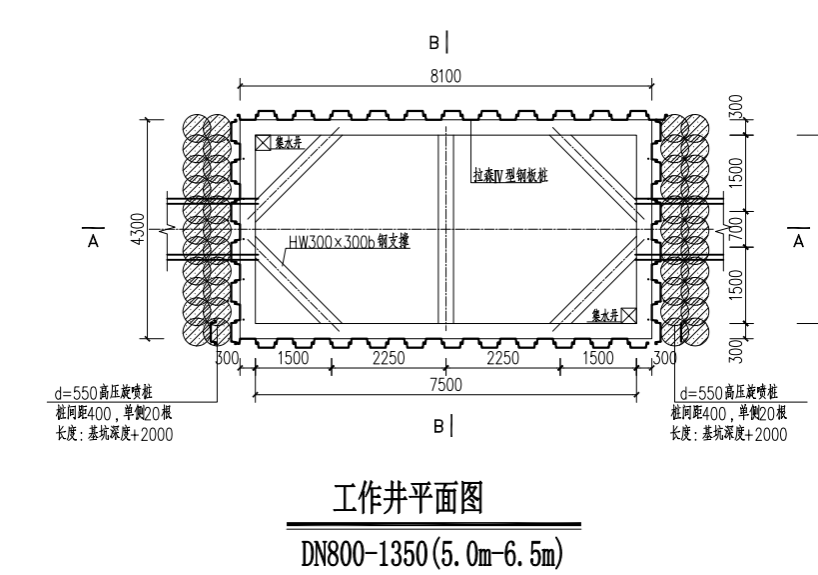 第一部分:AB段雨水管道管径为DN1000Ⅲ级钢筋混凝土钢承口管,全长42.6m,埋深3.0-5.0m,全部采用顶管法施工。AB段工作井平面尺寸长7.0m,宽4.0m,现场整平标高1001.0-1003.0m,井底标高997.6m,基坑深度3.4-5.4m。