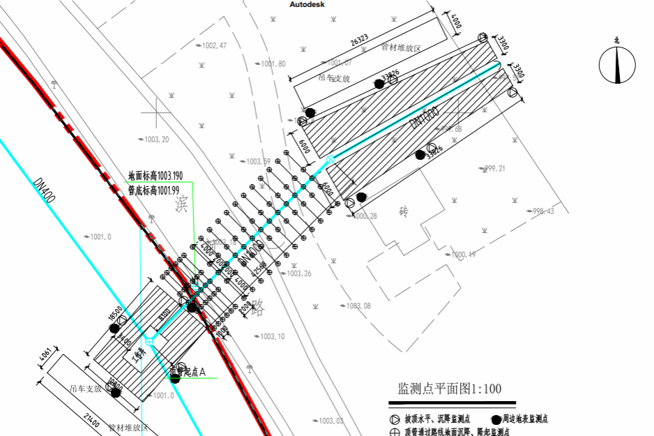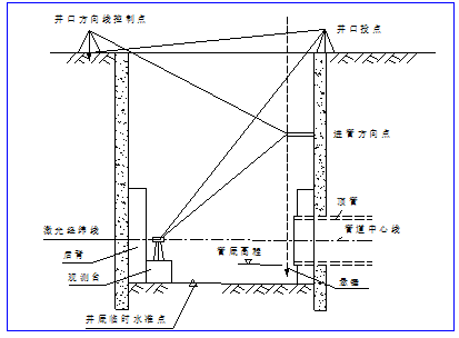 由于顶管施工是在工作井和明挖之间进行贯通,顶管的平面控制,利用统一坐标系统控制点,并布设光电测距导线。根据设计坡度要求,沿线路布设水准路线,并在井口处埋设临时水准点以供顶管高程放样。