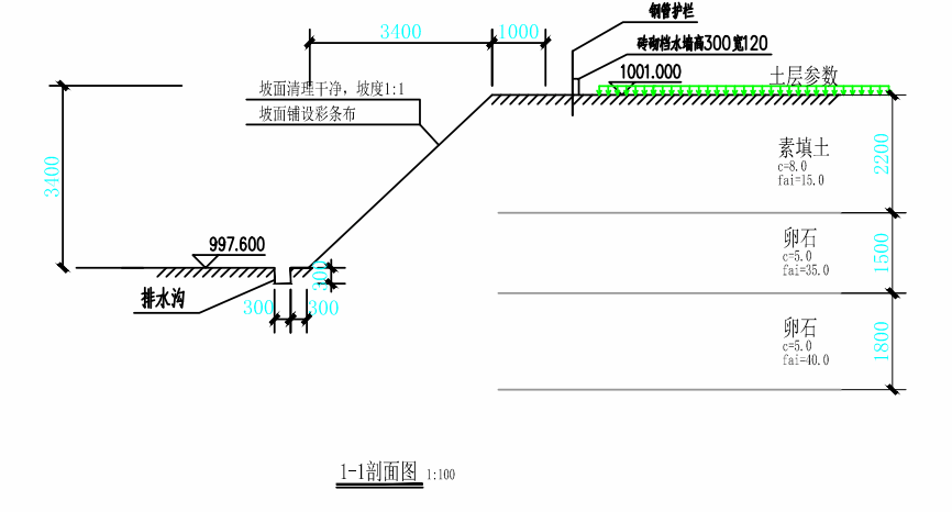 第二部分:BC段雨水管道管径为DN1000II级钢筋混凝土钢承口管,全长32.2m,埋深2.2-4.0m,全部采用明挖法施工。现场整平标高1000.0-1001.8m,井底标高997.8m,基坑深度2.2-4.0m。