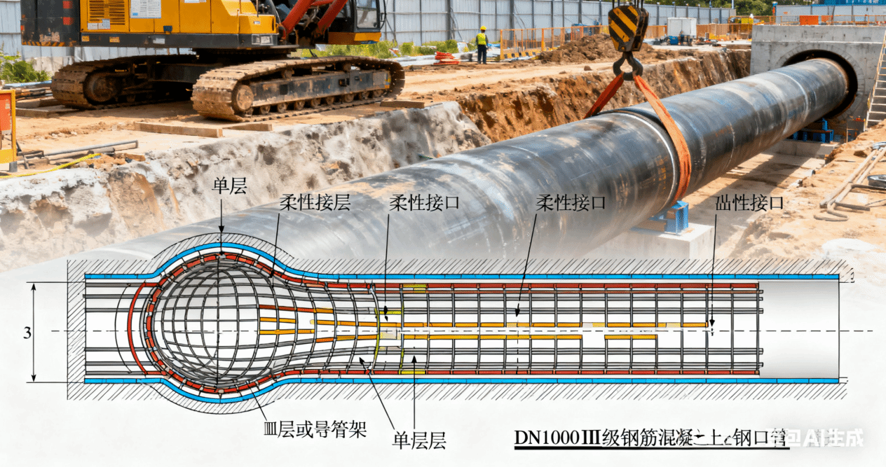 管材:顶进施工法所采用的混凝土管道,其管壁内部配置了单层或多层的钢筋骨架,以确保管道的稳固性和耐久性。这类混凝土圆管是顶进施工中的重要组成部分,承载着将管道顶入预定位置的任务。接口形式可划分为柔性接口与刚性接口两大类。同时,根据外压荷载的不同,接口又可细分为三个等级,即Ⅰ、Ⅱ、Ⅲ级。本工程采用DN1000Ⅲ级钢筋混凝土钢承口管。