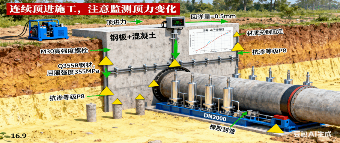 后背墙需全程承受顶进后座力,设计安装需满足:强度达标(抗顶进力破坏)、刚度充足(最小压缩回弹)、材质稳定(长期受力性能不变)。