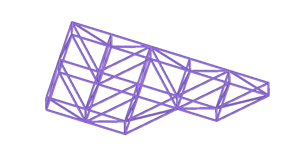 我们可以看到初步构思的力学模型为传统桁架结构,在此基础上形成一榀空间桁架结构(见结构模型1)。该模型可将整体梁系杆件的受弯形式,转变为杆件的拉压模式,进而解决木杆整体受弯弱的性质。其中该结构传力简单明确,受力均匀,可以合理利用杆件的拉、压特性,承载能力较大;但模型杆件较多,节点绑扎困难,自重大。而结构模型2采用角锥单元与绳索单元结合的结构形式,所用受压杆件为统一标准长度的木杆,受拉杆件采用绳索代替,杆件简洁,经济合理,具有美观性。