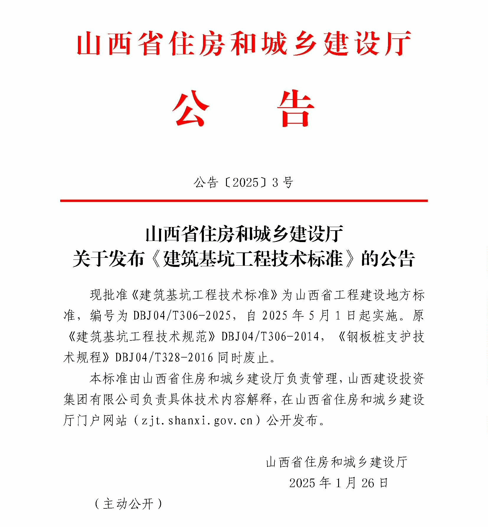 近日,山西省住房和城乡建设厅发布2025年3号公告,由山西建设投资集团有限公司及山西省建筑设计研究院有限公司牵头主编的编号为DBJ04/T306-2025的地方标准《建筑基坑工程技术标准》经批准颁布,自2025年5月1日起实施。