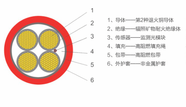智能预警电缆通常由导体、绝缘层、测温单元、内衬层和外护套组成。其中,测温单元是其关键部分,通常采用光纤传感技术,用于实时监测电缆温度,确保电缆运行状态的安全性。例如,中压智能预警防火电缆通过增设隔氧层和耐火层,并在电缆中嵌入分布式复合测温光纤,结合光纤激光器发射设备,实现对电缆“热”和“断”的精确感知。
