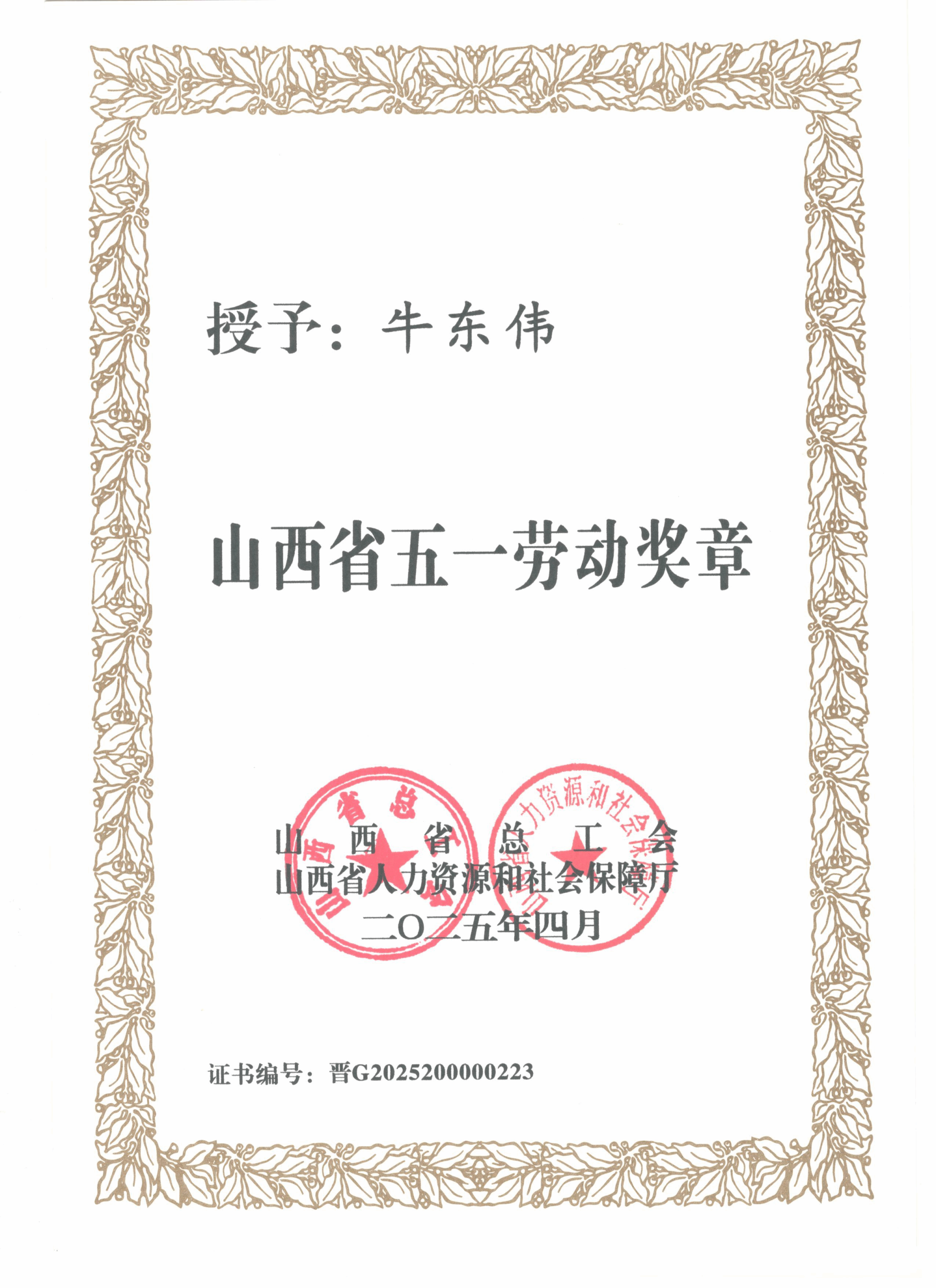 喜报!公司党委专职副书记、副董事长、工会主席牛东伟荣获山西省五一劳动奖章