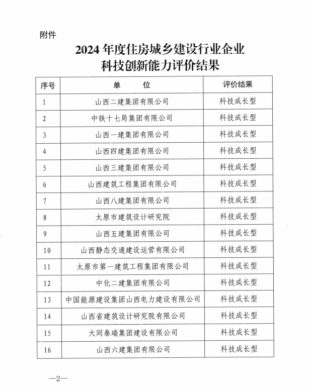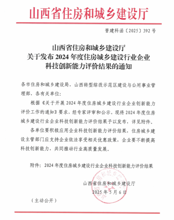 近日,山西省住房和城乡建设厅组织企业科技创新能力评价,我公司获评“2024年度山西省住房城乡建设行业科技成长型企业”。这是暨2024年获得“国家高新技术企业”认定之后,公司在科技创新领域又一项殊荣。