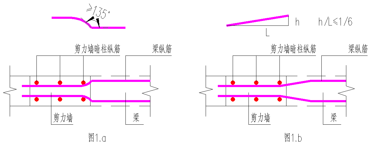 1.梁与剪力墙暗柱交接处,因梁纵筋与暗柱竖筋避让未进行处理,导致梁纵筋间距过近(钢筋端头几乎紧贴),混凝土振捣困难极易出现蜂窝麻面等缺陷,影响构件施工质量。按此种现状实施的话,梁的实际有效截面宽度会小于设计,给工程造成安全隐患。建议在施工时,类似情况可以通过梁钢筋“绕”暗柱纵筋(图1.a)或梁钢筋弯折(图1.b)的方法解决。同时,在设计时,应考虑梁纵筋和竖向构件纵筋(尤其是剪力墙结构)避让问题,配筋方案预留调整空间,确保施工操作可行性和结构安全性。