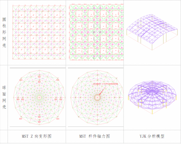 在方案比选环节,我们全面对比了双层抽空正放四角锥圆柱形网壳与双层肋环形四角锥球面网壳。从结构性能来看,圆柱形网壳在总质量上仅为球面网壳的42.30%,展现出显著的经济性优势;然而,在Z方向最大变形控制上,圆柱形网壳的变形量是球面网壳的2.30倍,这表明球面网壳在结构刚度上表现更佳。